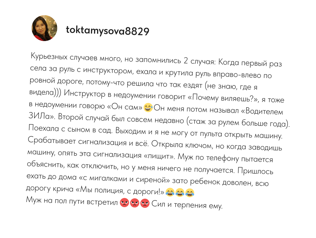 Чтобы не только обсудить проблему, но и внести вклад в развитие культуры вождения, EXEED Казахстан совместно с Академией безопасного вождения организовали специальный конкурс. Участницы делились своими самыми курьезными или экстремальными историями за рулем, а авторы двух лучших комментариев получили сертификаты на обучение в Академии безопасного вождения.