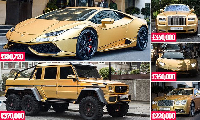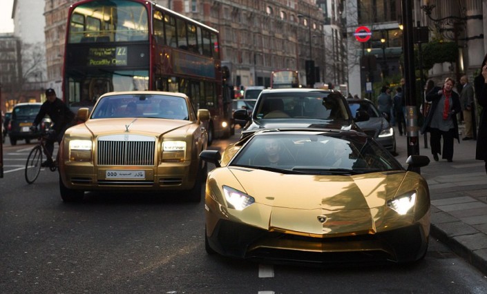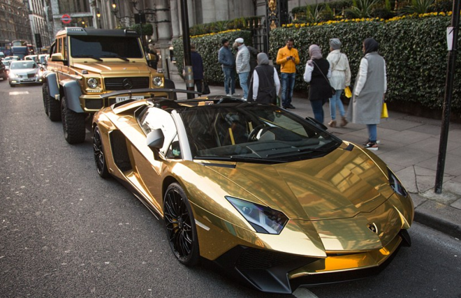 Принадлежащие арабу суперкары были замечены возле пятизвездочной гостиницы Mandarian Oriental в центре города, а также в лондонском районе Кенсингтон. Среди роскошных авто можно увидеть покрытые золотом Rolls-Royce Phantom Coupe, Lamborghini Aventador SV, Mercedes G63 и Bentley.
