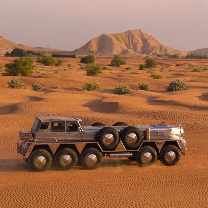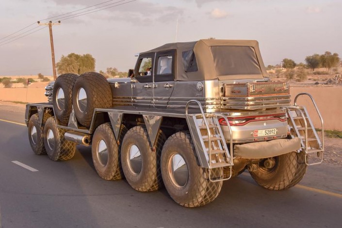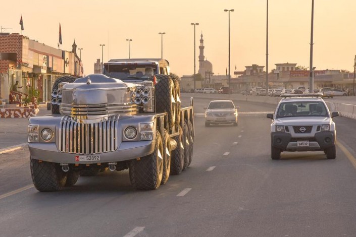 Передняя часть авто позаимствована у грузовика 40-х годов, кабина - у современного Jeep Wrangler Unlimited, фонари - у Ford Super Duty, а задний бампер - у Dodge Dart. Десятиколесный монстр получил имя Dhabiyan. Его ширина - 2,5 метра, высота - 3,2 метра.