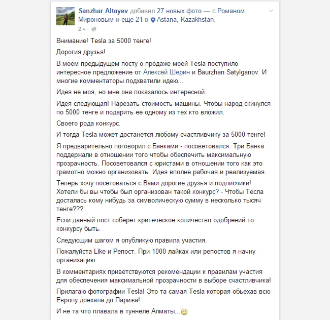 Накануне пользователей Facebook и автолюбителей в Казахстане взбудоражила новость - бизнесмен из Астаны выставил на продажу практически новую Tesla всего за пять тысяч тенге. "Идея следующая. Нарезать стоимость машины. Чтобы народ скинулся по 5000 тенге и подарить ее одному из тех, кто вложил. Идея не моя, но мне она показалась интересной. Своего рода конкурс. Tesla может достаться любому счастливчику за 5000 тенге", - написал Санжар Алтаев на своей странице в соцсети.