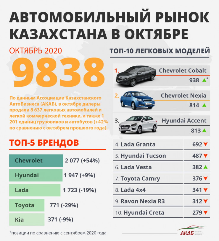 В лидерах самых продаваемых марок в октябре снова Chevrolet, дилеры продали 2 077 (+54 процента по сравнению с сентябрем) автомобилей производства костанайского "СарыаркаАвтоПрома". Hyundai на второй строчке – реализовано 1 947 автомобилей (+9 процентов). Lada – 1 723 единицы (-19 процентов). Toyota с результатом в 771 проданное авто на четвертой позиции (-29 процентов). Kia на пятой строчке – 371 единица (-9 процентов). Ravon, продажи которого постепенно замещает Chevrolet, на шестой строчке самых продаваемых автомобилей в Казахстане (358 единиц; -42 процента). Седьмая позиция у JAC – 268 единиц (-17 процентов). На восьмом месте Renault - 245 (-2 процента). Топ-10 наиболее успешных замыкают: Volkswagen (218 единиц; -36 процентов), Nissan (183 единицы; -35 процентов) и Mitsubishi (104 единицы; +20 процентов).