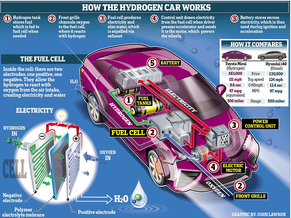 Принцип работы автомобиля будущего следующий: водород смешивается в топливной ячейке с кислородом из воздуха и в результате химической реакции производится электричество, которое используется для электромотора машины. Конечным продуктом такой реакции является вода.