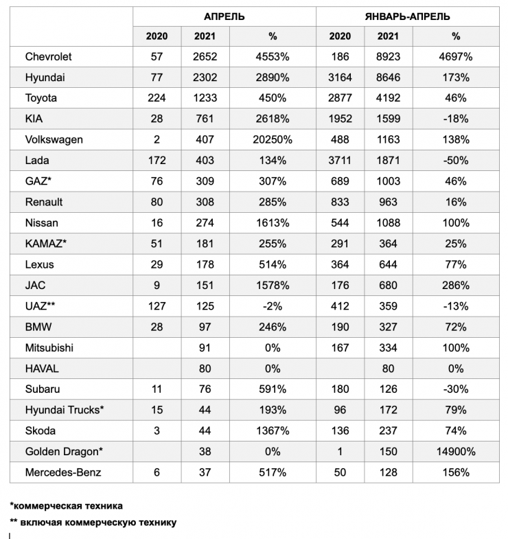 Кумулятивные продажи за первые четыре месяца достигли 34 199 единиц, совокупный прирост по сравнению с прошлым годом составил 79,7 процента. Столь значительный рост связан в первую очередь с пандемией и локдауном ровно год назад, когда было продано чуть больше тысячи автомобилей, в итоге апрель 2020 года стал наихудшим месяцем в истории казахстанского автобизнеса.