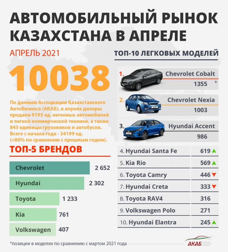 По данным Ассоциации казахстанского автобизнеса (АКАБ), в апреле 2021 года продажи новых автомобилей в Казахстане впервые в этом году перешагнули отметку в 10 тысяч авто в месяц и по сравнению с мартом 2021 года увеличились на 20 процентов - до 9 195 легковых автомобилей и легкой коммерческой техники, а также 843 единиц грузовиков, спецтехники и автобусов.