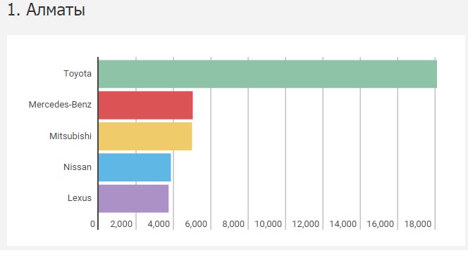 "Но если копнуть глубже и рассмотреть ситуацию не в масштабе страны, а в пределах городов, то можно найти и исключение из правил. Рассмотрев вторичный рынок в пяти городах с наибольшей долей перерегистраций (Алматы, Астана, Шымкент, Караганда и Тараз), мы вывели отдельный рейтинг популярности марок среди б/у автомобилей", - пишет издание.