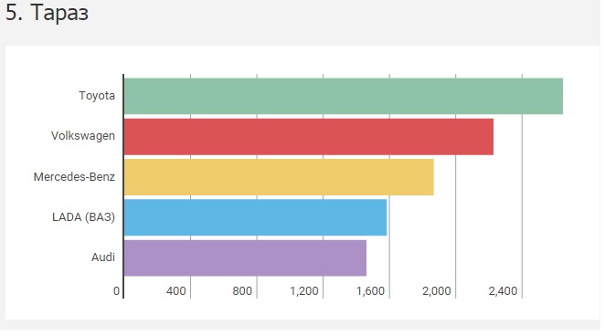 Замыкает ТОП-5 городов с наибольшей долей перерегистраций (с результатом более 15 тысяч) Тараз. Лидером здесь, как и практически во всех других населенных пунктах, стала Toyota (более 2,6 тысячи). На второй и третьей строчке закрепились "немцы" - Volkswagen (2,2 тысячи) и Mercedes-Benz (1,8 тысячи).