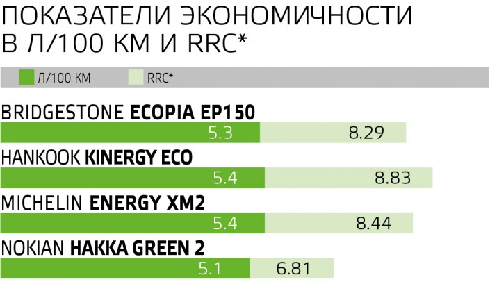 Методика измерений расхода топлива - прохождение дистанции 10 километров с постоянной скоростью 80 километров в час с активированным круиз-контролем. Коэффициент сопротивления качению демонстрирует потребление энергии во время деформации покрышки, которая возникает во время сцепления шины с дорогой. Чем ниже показатель, тем экономичнее покрышка. Разница между крайними результатами составляет 300 граммов бензина на каждую сотню. За 50 тысяч километров водитель может сэкономить 150 литров топлива.