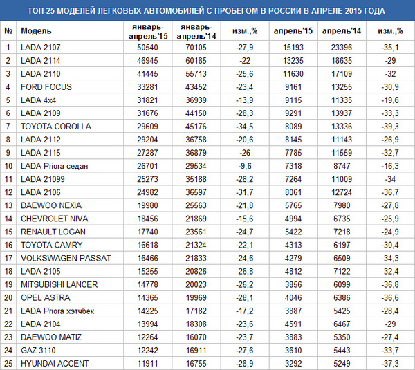 По итогам четырех месяцев 2015 года падение продаж подержанных авто составило 22,7 процента по сравнению с 2014 годом. При этом объем рынка составил 1,5 миллиона автомобилей. Отмечается, что самым популярным подержанным авто в апреле 2015 года в России стала Lada. Всего в прошлом месяце их было продано 133,8 тысячи.