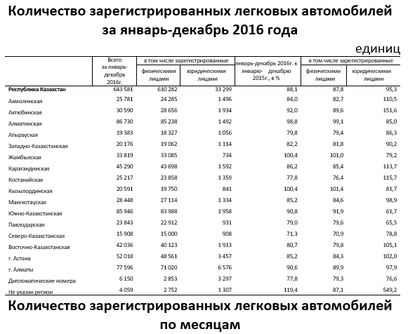 По данным ведомства, за январь-декабрь 2016 года в Республике Казахстан зарегистрирован 643 581 легковой автомобиль, или на 11,9 процента меньше, чем в соответствующем периоде прошлого года. По состоянию на 1 января 2017 года в Республике Казахстан количество зарегистрированных легковых автомобилей составило 3845,3 тысячи единиц.