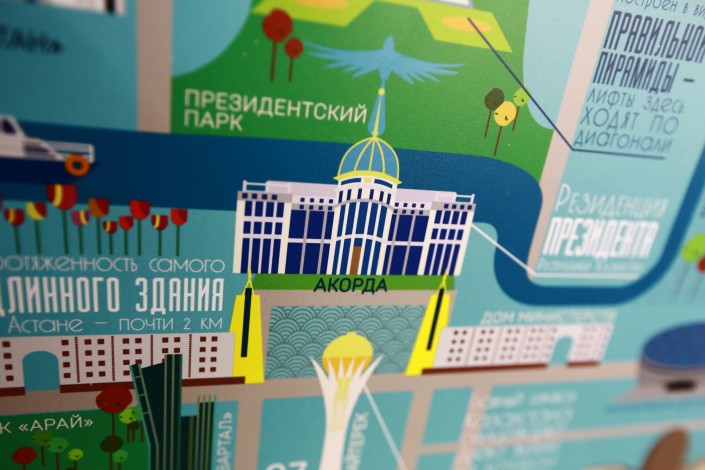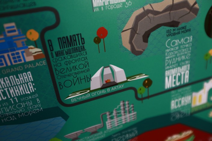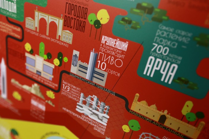 В издание, непривычно большого формата, вошли 19 красочных карт, по одной на каждую область Казахстана и два города республиканского значения. Каждая карта представляет собой содержательную инфографику с интересными фактами о Казахстане, короткими историями о достопримечательностях, местах рождения крупных фигур истории, краснокнижных и просто милых зверях и прочих интересностях страны.