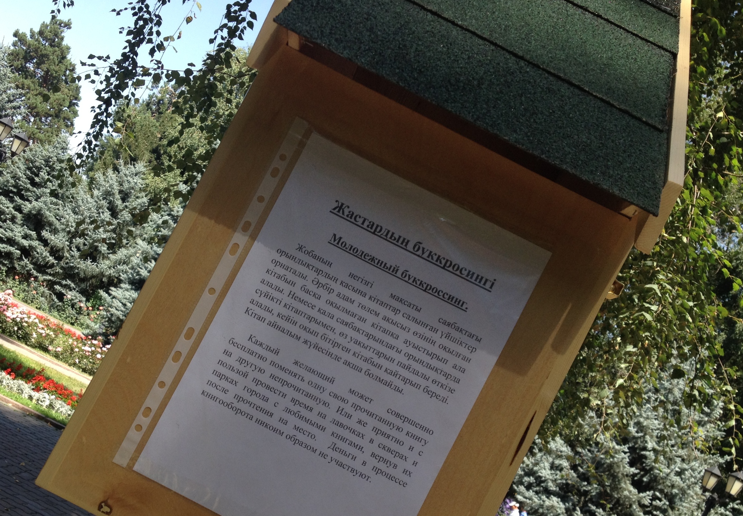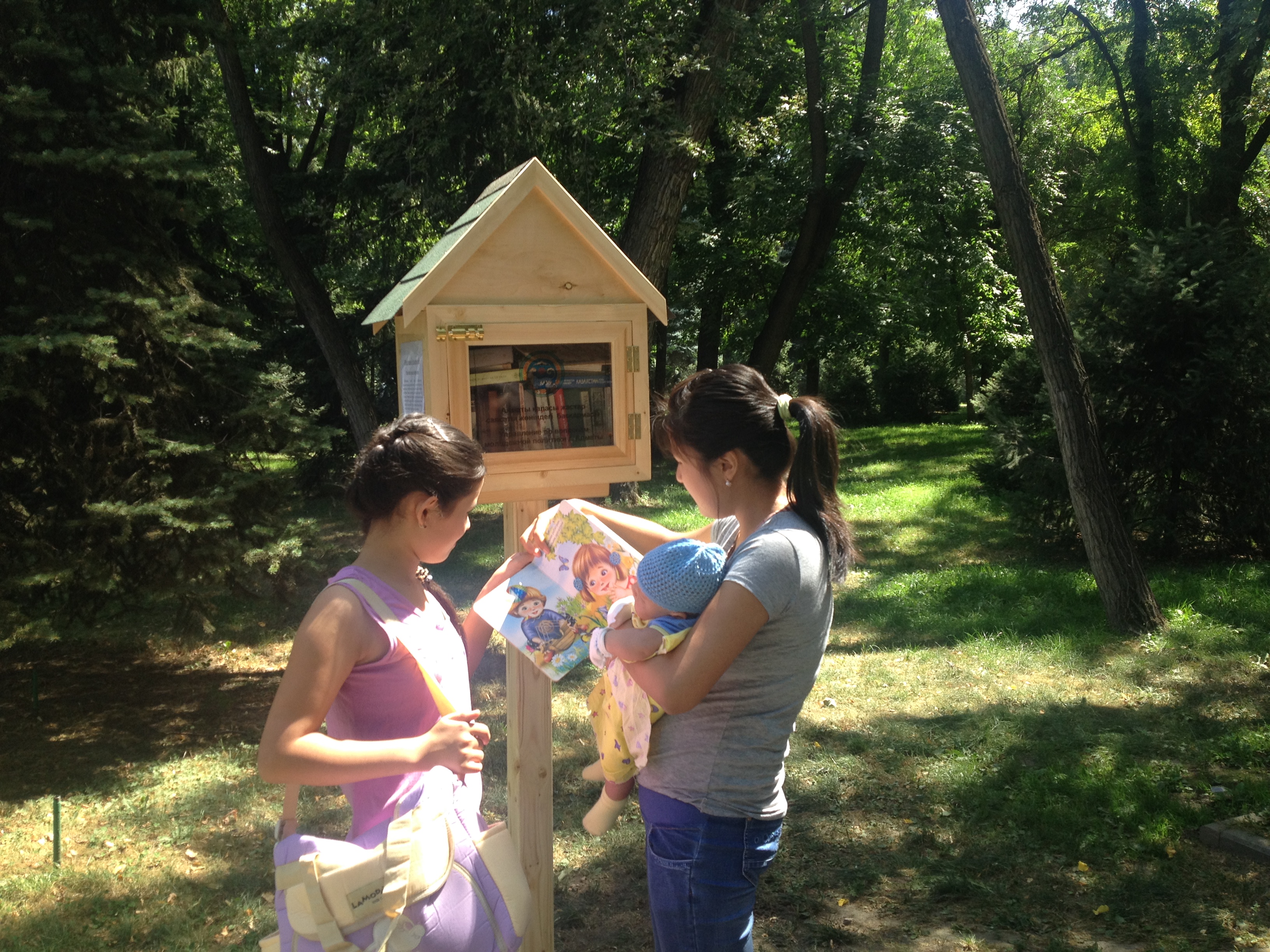Оригинальный проект нацелен на развитие городской молодежи и повышение культуры в парках Алматы. Рядом со скамейками установлены аккуратные домики в виде скворечников, в которых можно найти книги на трех языках: казахском, русском и английском. Книги самые разные - произведения классиков, зарубежная современная литература, словари и другое. Стоит отметить, что книжные "скворечники" сконструированы герметично, поэтому влага внутрь не проникнет.