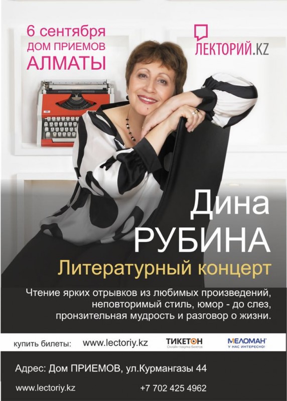 Поэтому приезд Дины Рубиной в Алматы - это подарок не только читателям и поклонникам, но и всем любителям сочного слова, яркого чувства, сильной мысли. "Мои творческие вечера - и это уже знают многие - на самом деле литературные концерты вполне эстрадного стиля. Это авторская программа, в которой сплетены байки и авторское чтение ярких отрывков или маленьких рассказов", - говорит Дина Рубина о своих выступлениях. Также в программе вечера - обязательный разговор с публикой, как всегда без посредников.
