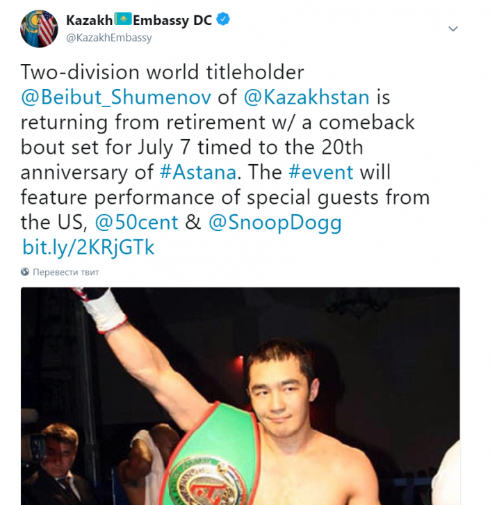 "Двукратный чемпион мира @Beibut_Shumenov @Kazakhstan возвращается с реваншем 7 июля, приуроченным к 20-летию #Astana. В #event будут представлены выступления специальных гостей из США, @50cent & @SnoopDogg", - сообщает официальный Twitter посольства.
