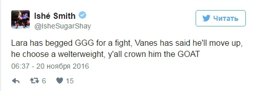 Бывший чемпион мира в первом среднем весе американец Ише Смит (29-8, 12 КО), интересы которого представляет компания Mayweather Promotions, в резкой форме раскритиковал Геннадия Головкина, опубликовав на своей странице в Twitter оскорбительный твит.