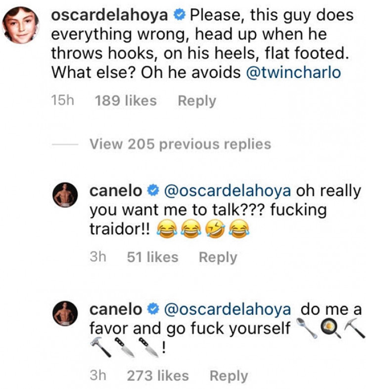 Чемпион мира в четырех весовых категориях мексиканский боксер Сауль Канело Альварес устроил перепалку в соцсетях со своим бывшим промоутером Оскаром Де Ла Хойей из Golden Boy Promotions, передает Tengrinews.kz со ссылкой на Vesti.kz.