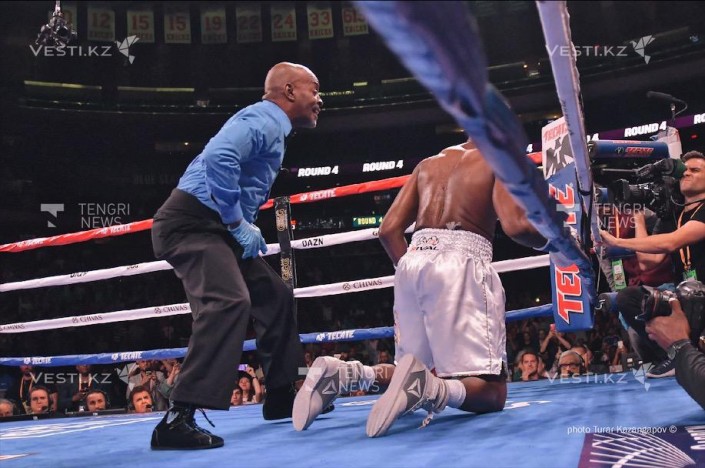Геннадий Головкин победил Стива Роллса нокаутом, передает корреспондент Tengrinews.kz. Казахстанец одержал победу над соперником в четвертом раунде своим фирменным ударом левой рукой.