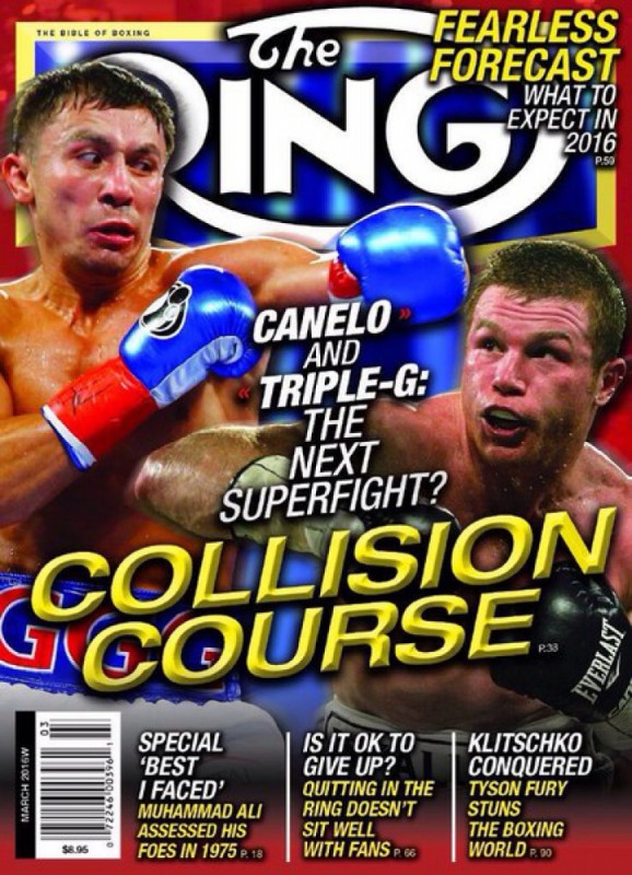 На обложке издания GGG изображен вместе с обладателем пояса WBC в среднем весе мексиканцем Саулем "Канело" Альваресом. Статья в журнале The Ring получила название "Канело и Triple-G: Cледующий суперфайт?". Добавим, что команда Альвареса до 11 декабря должна принять решение о бое с Головкиным. Казахстанец является обязательным претендентом на титул мексиканца.