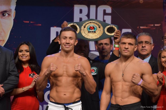 Геннадий Головкин и украинец Сергей Деревянченко провели официальную церемонию взвешивания и последнюю дуэль взглядов перед боем в Нью-Йорке за титулы чемпиона мира в среднем весе по версиям IBF и IBO, передает корреспондент Vesti.kz.