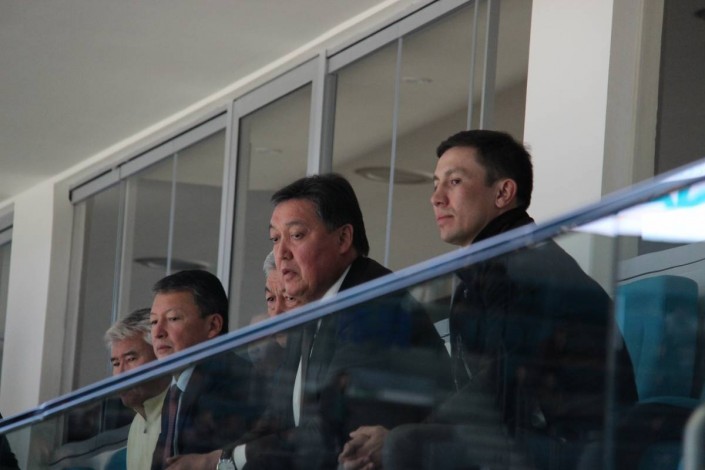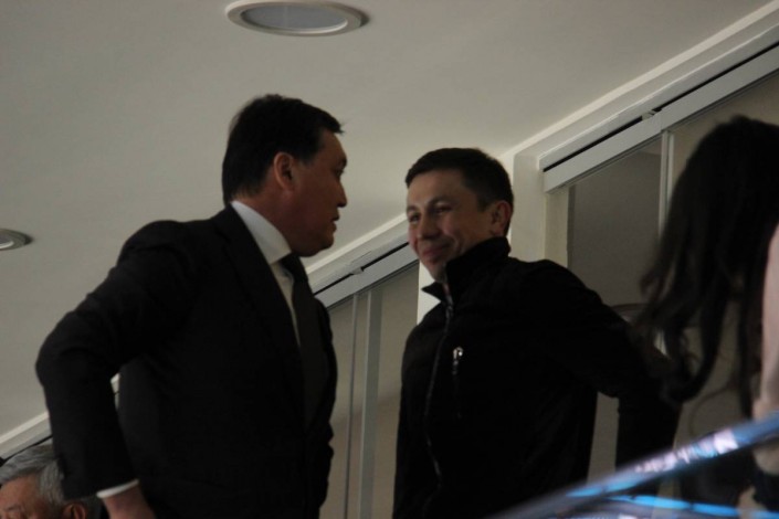 Бывший чемпион мира в среднем весе смотрел за игрой хоккеистов в компании первого вице-премьера Аскара Мамина, главы Национального олимпийского комитета Тимура Кулибаева, министра культуры и спорта Арыстанбека Мухамедиулы, президента Федерации гольфа Нуртая Абыкаева.