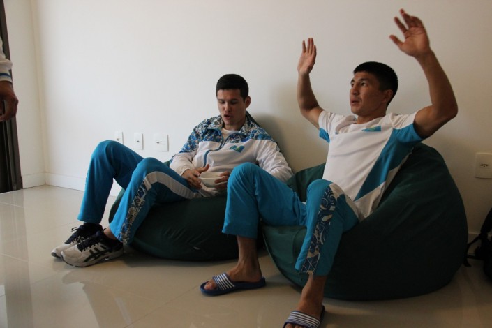 Действительно, помещение не очень большое, но достаточно комфортное в бытовом плане. "Мы готовимся к турниру. Все мысли о ринге, - рассказал призер Чемпионата мира-2013 Берик Абдрахманов. - Мы еще не покидали деревню. Зал для тренировок и столовая находятся недалеко от нашего дома. Нам сейчас не до прогулок".