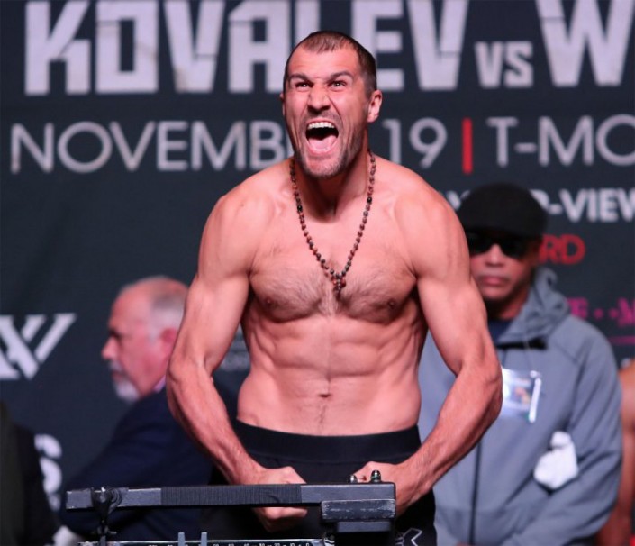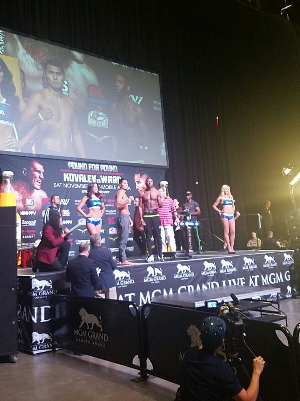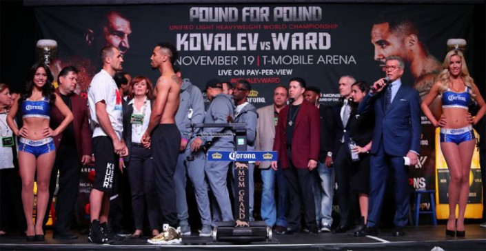 18 ноября в Лас-Вегасе состоялась процедура взвешивания перед боксерским шоу, главным событием которого станет бой чемпиона мира в полутяжелом весе россиянина Сергея Ковалева (30-0-1, 26 КО) с американцем Андре Уордом (30-0, 15 КО), сообщает портал Vesti.kz. Оба боксера показали на весах одинаковый вес - 175 фунтов (79,4 килограмма).