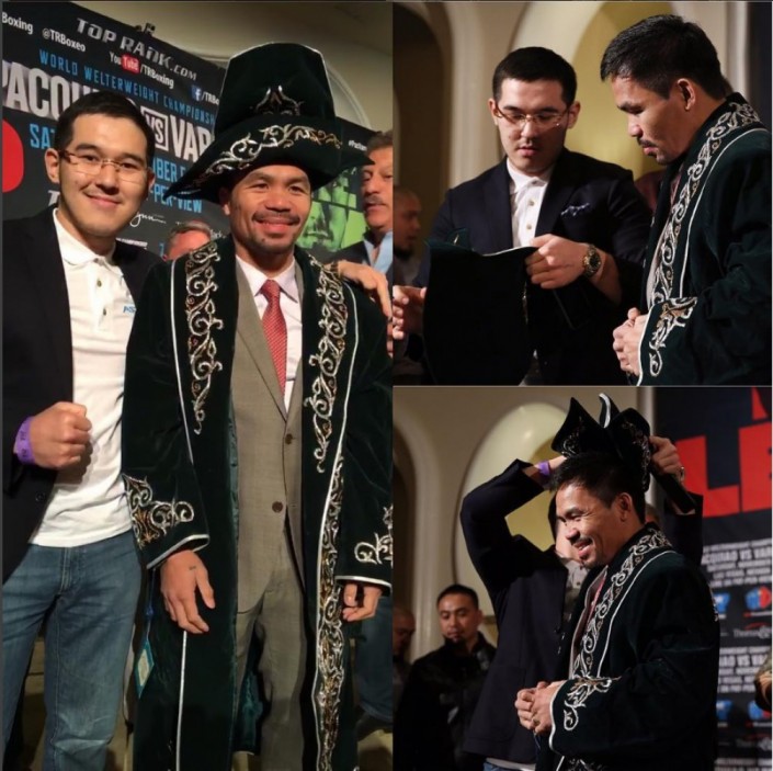 "Меня пригласил промоутер Мэнни на пресс-конференцию перед его ноябрьским боем в Лас-Вегасе с Джесси Варгасом. Я всегда хотел подарить Пакьяо казахский чапан. Я давно подобрал его по пропорциям и вручил ему нашу национальную одежду. Он очень обрадовался, сразу узнал в нем халат Головкина. А его менеджер даже лукаво сказал, что в следующий раз Пакьяо выйдет в нем на бой", - рассказал Алихан Жарылгапов.