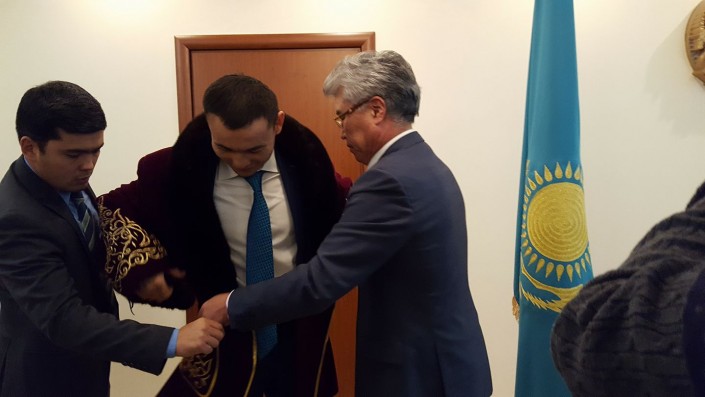 Министр культуры и спорта Казахстана Арыстанбек Мухамедиулы подарил боксеру Канату Исламу казахский чапан, сообщают Vesti.kz. Отмечается, что их встреча состоялась в Астане сегодня, 4 ноября.