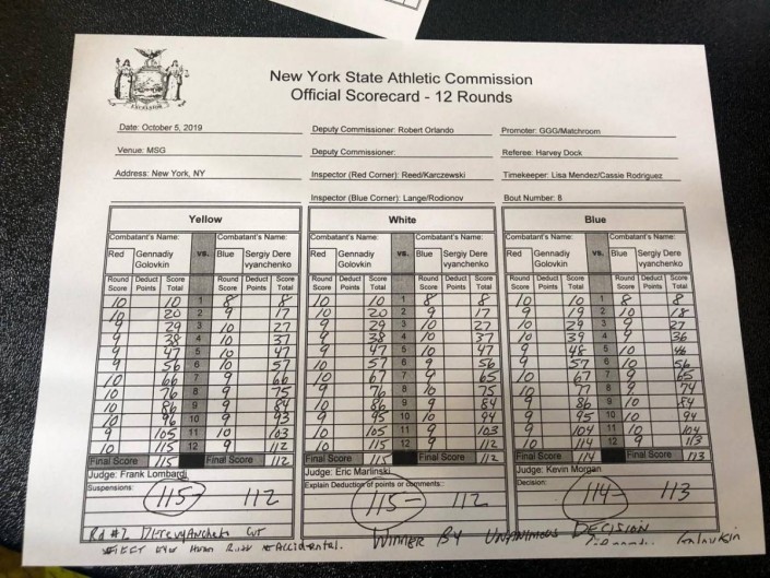 Опубликовано фото судейских записок боя между казахстанцем Геннадием Головкиным и украинцем Сергеем Деревянченко, передает Tengrinews.kz со ссылкой на Vesti.kz.