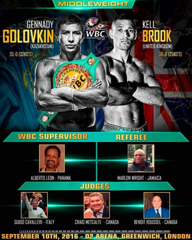Стали известны судьи поединка между чемпионом мира по версиям WBA (Super), IBO, IBF и WBC в среднем весе казахстанцем Геннадием Головкиным и обладателем пояса IBF в полусреднем весе британцем Келлом Бруком, сообщает Vesti.kz.