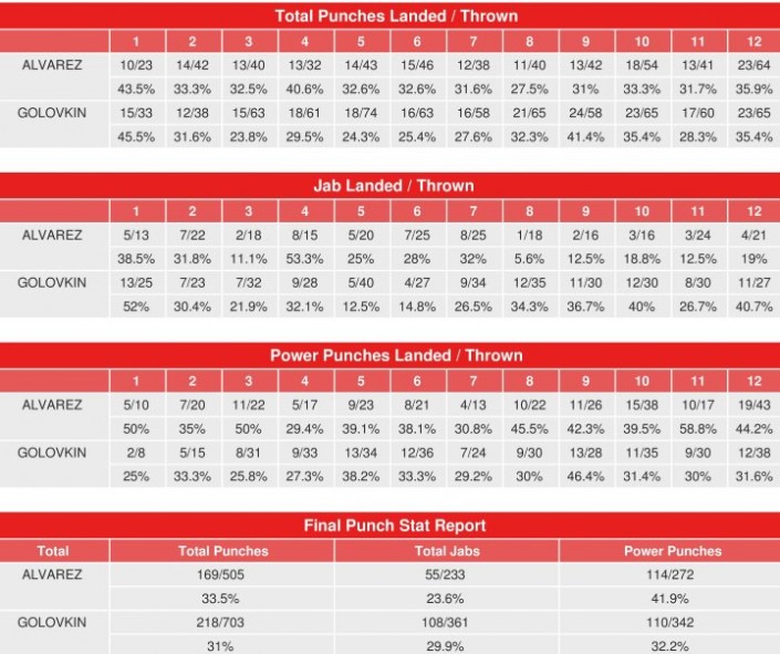 Автор канала "Ветеран второразрядник" на YouTube провел подробный анализ поединка между Геннадием Головкиным и Саулем Альваресом, основываясь на статистике CompuBox, опубликованной на сайте Boxingscene.com, и судейским запискам.