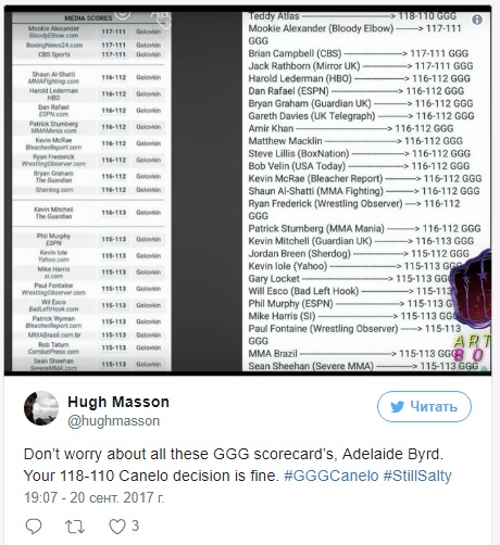 Затем американский блогер Хью Массон собрал мнения экспертов и опубликовал на своем аккаунте в Twitter. По этим данным, многие эксперты, в числе которых обозреватель ESPN Дэн Рафаэль, аналитик НВО Гарольд Ледерман и редактор сайта издания The Ring Дуглас Фишер, признали убедительную победу Головкина.