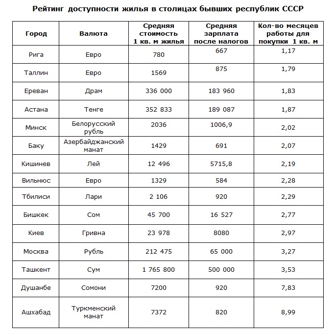 Дольше всего ради одного квадратного метра в столице придется работать жителям Душанбе и Ашхабада - по 8 и 9 месяцев соответственно.