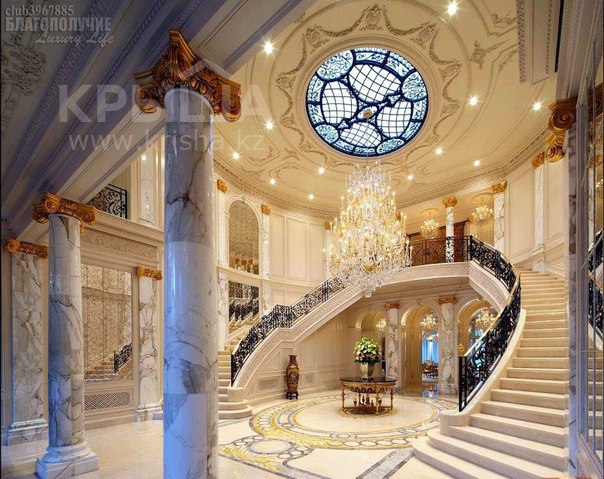 Дом в Алматы построен в виде дворца в классическом стиле. Кроме того, особняк оформлен по авторскому дизайну. На первом уровне расположились бассейн, сауна, хамам, кухня, столовая, спортзал. На втором уровне - три спальни, кабинет, а на третьем уровне находится мансарда, две спальни, игровая комната и на цокольном этаже - тренажерный зал, кухня для персонала, склад, прачечная, восемь ванн.