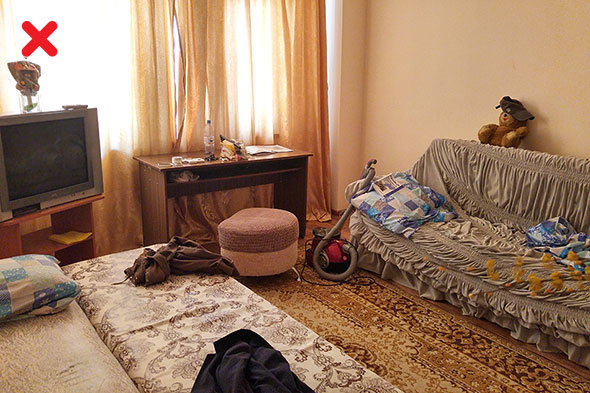 Перед съемкой вовсе не обязательно проводить генеральную уборку. Достаточно спрятать висящую на стуле одежду, тапки, разбросанные игрушки, мелкую бытовую технику и избавиться от пыли в общедоступных местах. На это уйдет не так много времени, как кажется на первый взгляд. Чтобы превратить зал из катастрофы в приличную комнату, нам понадобилось всего десять минут.