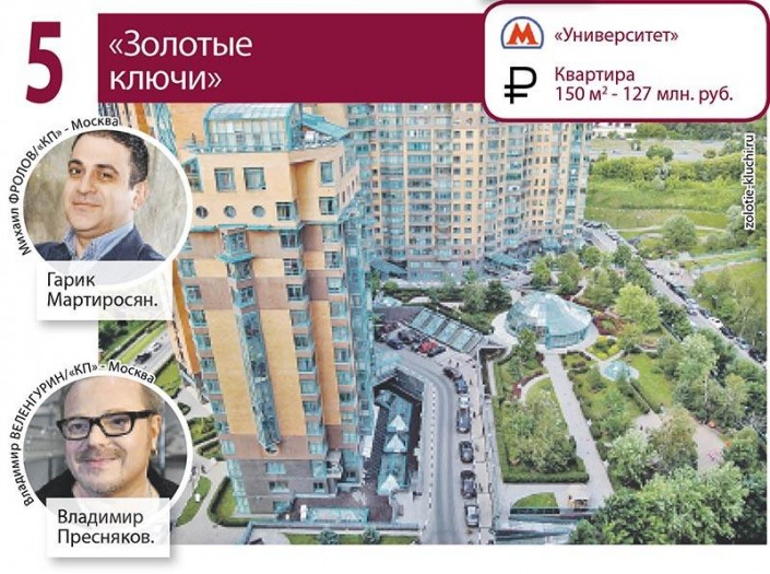 В ЖК "Золотые ключи" и "Золотые ключи-2" квартиры есть у Гарика Мартиросяна, Владимира Преснякова, Елены Воробей, Тимати. Дома комплекса стоят в пойме реки Раменки, во дворе есть пруд, цветники, альпийские горки, теннисные корты, спа и фитнес-центры.