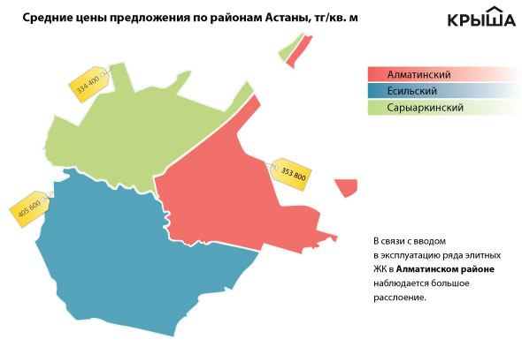 Третий по популярности район столицы - Сарыаркинский. Сравнительно высокая средняя цена - 334 400 тенге за квадратный метр - отчасти связана с тем, что в этом районе находится так называемый "золотой квадрат". Наиболее дорогое жилье - в районе парка, набережной, старой площади и на проспекте Республики.