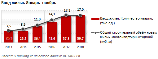 По итогам 11 месяцев казахстанские застройщики ввели в эксплуатацию 59,7 тысячи новых квартир в многоэтажках, что на 2 тысячи больше, чем годом ранее.