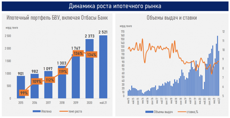 - несмотря на растущие объемы выдачи ипотеки в январе-мае текущего года (592 миллиарда тенге против 216,3 миллиарда за 5 месяцев 2020 года и 270 миллиардов за 5 месяцев 2019 года), темпы роста ипотечного портфеля снижаются за счет существенного объема погашений (483 миллиарда тенге), осуществляемых в рамках досрочного изъятия пенсионных накоплений;