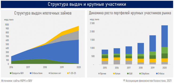 По данным аналитиков, регионы страны имеют неравномерное распределение в портфеле ипотеки, демонстрируя высокую концентрацию в крупных городах - Нур-Султан и Алматы - 52 процента рынка. Четверть рынка ипотеки приходится на Мангистаускую, Актюбинскую, Восточно-Казахстанскую и Карагандинскую области и город Шымкент; в портфеле на долю областей приходится от 4 до 6 процентов. Темпы роста ипотечного кредитования в данных регионах и городах достигали от 23 до 48 процентов в 2020 году.