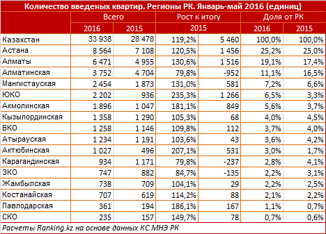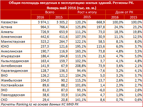 "При этом, как и годом ранее, столица продолжает удерживать лидирующие позиции по вводу зданий в эксплуатацию (за январь-май 2016 года). Было введено более 900 тысяч квадратных метров жилья. Второе место занимает Алматы (введено более 700 тысяч квадратных метров.), также высоки доли Алматинской области и Мангыстау. Всего в Казахстане с января по май было введено почти 4 миллиона квадратных метров жилья, что на 20 процентов больше, по сравнению с аналогичным периодом прошлого года. Количество введенных квартир составило 33 938, из них индивидуальными застройщиками 13 682 единицы", - говорится в распространенном сообщении.