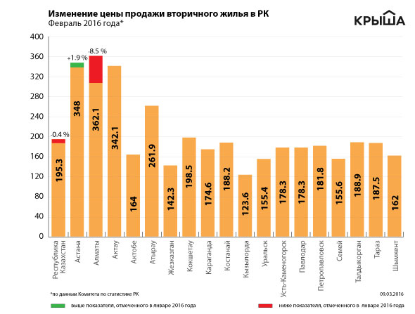 Наряду с этим, вторичный рынок недвижимости в феврале 2016 года также продемонстрировал снижение. "Средние цены по Казахстану остановились на отметке 195,3 тысячи тенге за квадрат, что на 0,4 процента меньше показателей января. Любопытно, что данное снижение произошло за счет продавцов Алматы: - 8,5 процента (362,1 тысячи тенге за квадрат). В Астане, напротив, цены немного подросли: +1,9 процента (348 тысяч тенге за квадрат). В остальных крупных городах РК цена продажи квадратного метра жилья на вторичном рынке не изменилась", - подчеркнули аналитики.