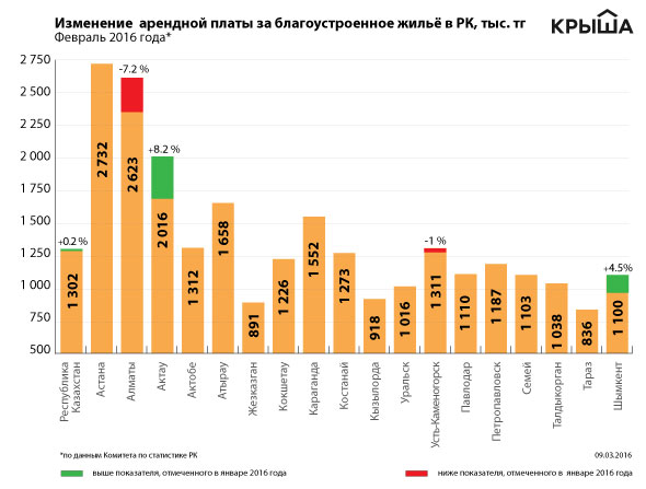 "В противовес стоимости продажи плата за аренду жилья в феврале 2016 года повысилась на 0,2 процента, достигнув отметки 1302 тенге за квадрат. В лидерах оказались Актау (+8,2 процента) и Шымкент (+4,5 процента). При этом арендодатели Алматы за месяц умерили свои аппетиты на 7,2 процента, Усть-Каменогорска - на 1 процент. В остальных городах Казахстана изменений по сравнению с январем 2016 года не произошло", - отметили они.