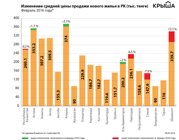 Так, по информации Комитета по статистике Министерства национальной экономики РК, в феврале 2016 года средняя цена нового жилья в Казахстане составила 260,1 тысячи тенге за квадрат, что на 0,2 процента ниже январских показателей.