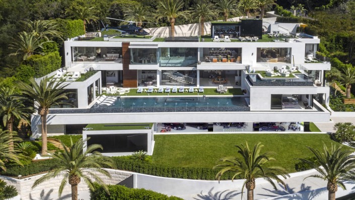 Площадь недвижимости, расположенной в элитном районе Бель-Эйр, составляет 3 530 квадратных метров. В доме 12 спален, 21 ванная комната, три кухни, боулинг, кинотеатр на 40 человек, 85-метровый бассейн с живописным видом и баром, спа, фитнесс-зал, два винных погреба, а также "конфетная комната", заполненная сладостями на 200 тысяч долларов. Особняк украшен 130 произведениями искусства.