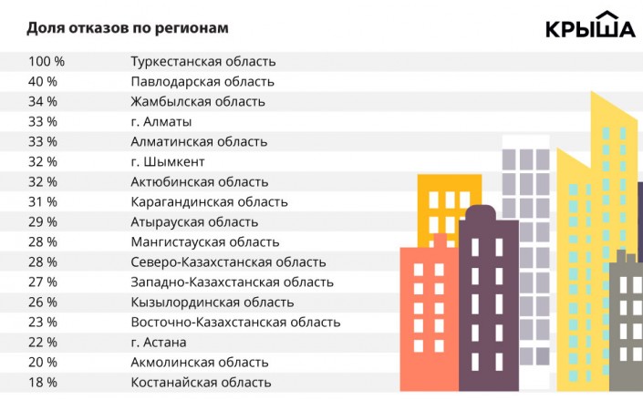 Помимо Туркестанской области, худшие показатели зафиксированы в Павлодарской области (40 процентов отказов от общего количества заявок, по которым принято решение), Жамбылской области (34 процента), Алматы и Алматинской области (33 процента), а также в Шымкенте (32 процента).