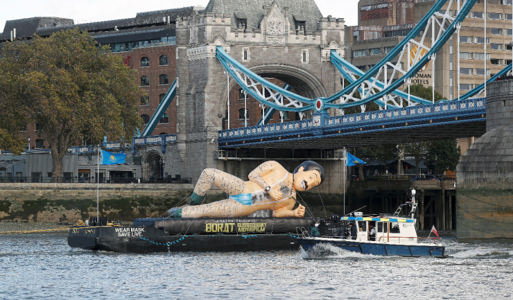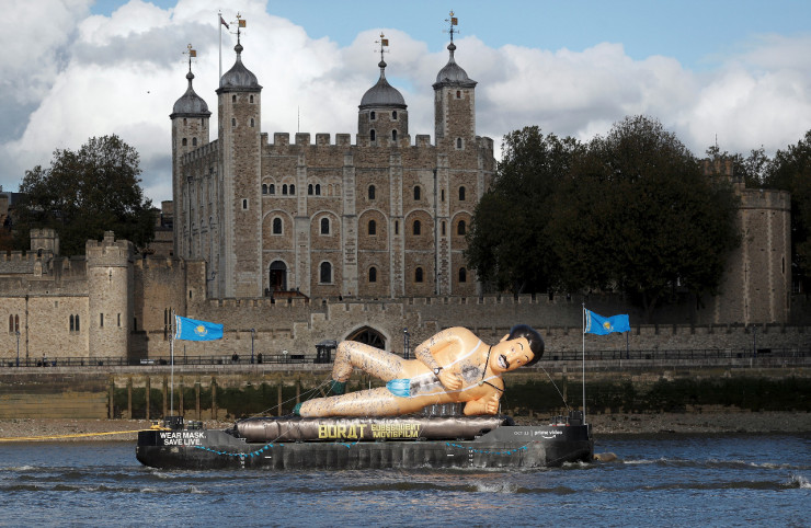 Акция в честь выхода фильма прошла также в центре Лондона. По реке Темзе проплыла большая надувная копия персонажа Саши Барона Коэна в "маскини" и с флагом Казахстана. Баржа с фигуркой Бората проплыла мимо главных достопримечательностей столицы Великобритании, включая Лондонский Тауэр.