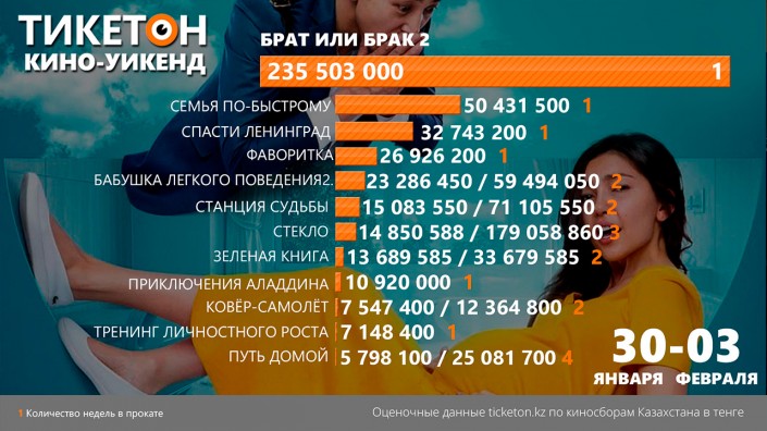 По информации сервиса Ticketon.kz, только за первые выходные комедия собрала более 230 миллионов тенге. Для сравнения, "Семья по-быстрому" с Марком Уолбергом за тот же срок заработала около 50 миллионов.