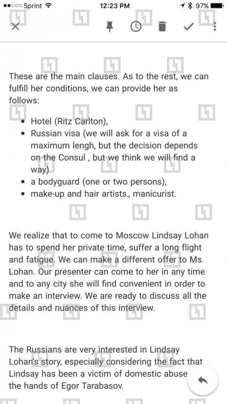 В ответ Лохан выставила список требований, в числе которых гонорар в размере 500 тысяч фунтов стерлингов, номер в отеле "Ритц-Карлтон", круглосуточная охрана, частный самолет для доставки в Москву и обратно, а также годовая виза, парикмахеры и стилисты. Помимо этого, рыжеволосая знаменитость якобы попросила встречу с Владимиром Путиным.