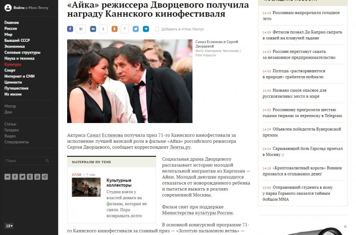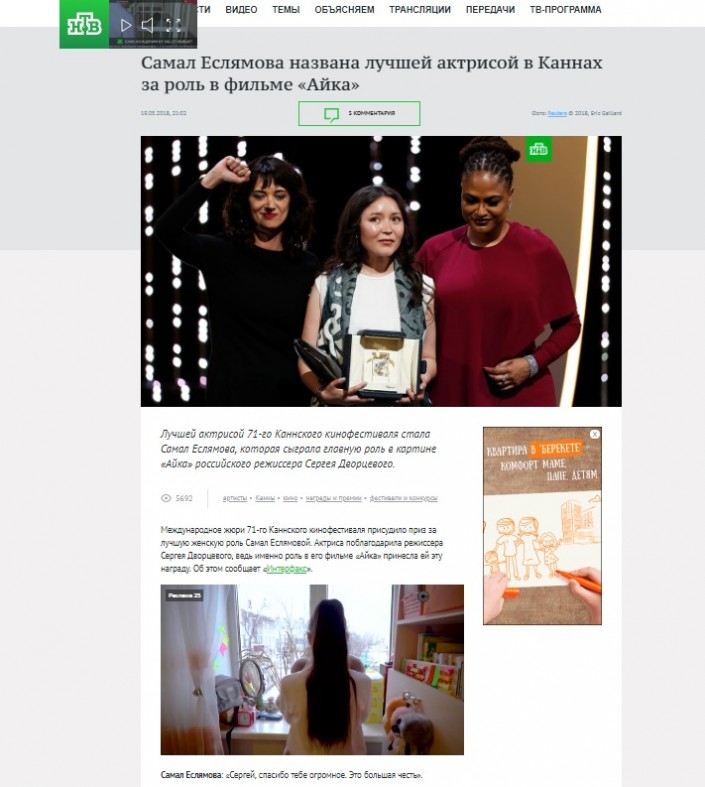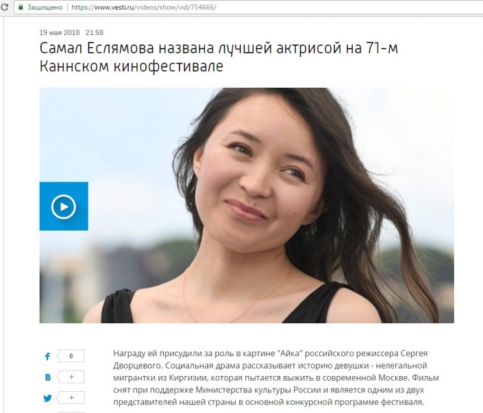 Новость о том, что фильм российского режиссера Дворцевого получил награду в номинации "Лучшая женская роль", и о ее исполнительнице Самал Еслямовой в тот же день вышла во многих ведущих СМИ России, в том числе на федеральных телеканалах "Россия 24" и "Первый канал".