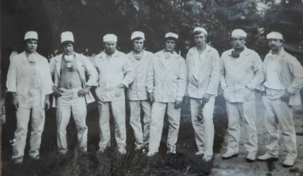 Отряд тульских шахтеров в белой спецодежде работников атомной станции. 1986 год. © myslo.ru